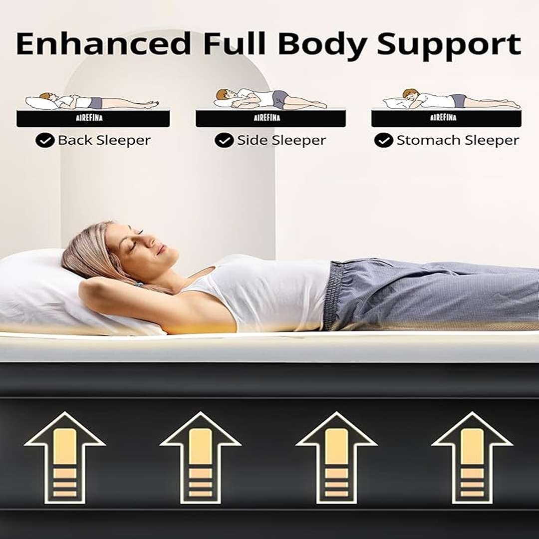 The built-in electric pump inflates or deflates the mattress in just 2 minutes with a single click. It also minimizes air leakage and saves time, making the inflatable twin air mattress convenient for both daily and travel use.